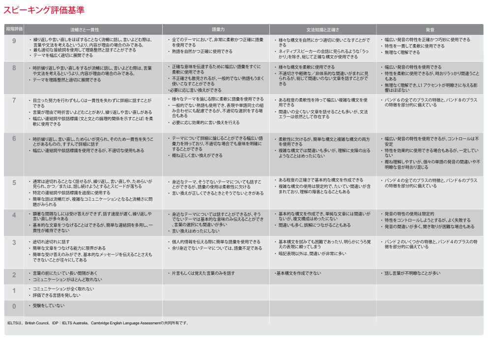 スピーキングの評価基準は以下の通りです。