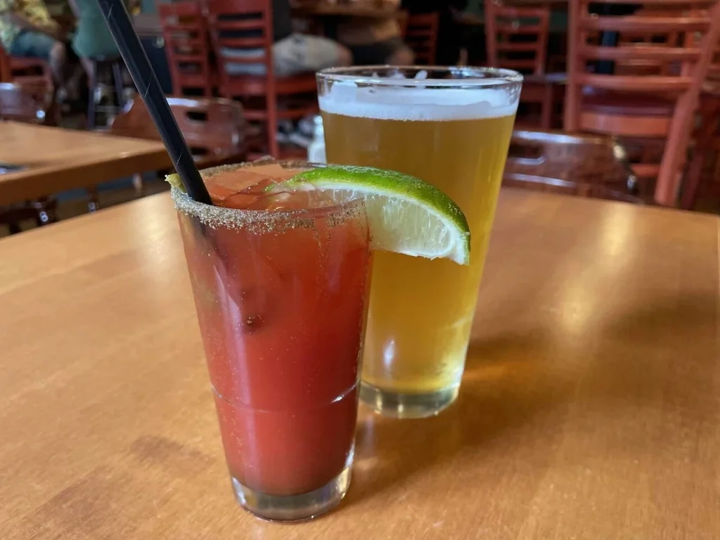 シーザーはカナダ発祥のカクテルで、クラマトジュース、ウォッカ、ウスターソース、タバスコ、スパイスなどが入っています。さらに上にピクルスなどのトッピングが添えられています。